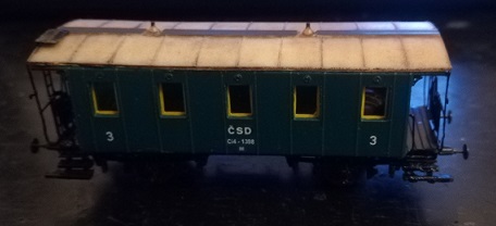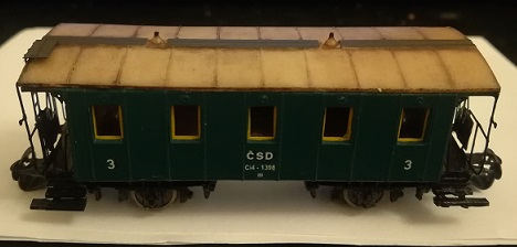 Tak mi Webnode napsal, že brzy překročím limit dat na měsíc listopad. Proto jsem musel najít nějakou malou stavebničku, abych i ten zbytek dat vyždímal. Předlohou modelu je vůz, který byl vyráběn na přelomu 19. a 20. století pro železnice v bývalém Rakousko - Uhersku. Je to starší druh vozu, který ještě není vybaven záchodem a vevnitř vozu se nalézá pouze jeden velký oddíl. Model představuje vůz, jak jezdil na začátku třicátých let dvacátého století. Jistě zaujme každého modeláře, když k nástupišti přijede mašinka - Kafemlejnek se soupravou malých pětiokenních vozů, z toho tento je ještě jako stará "plečka" vybaven plynojemem na spodku vozu a plynovými lampami, ku kterým se přicházelo po střešních lávkách vozu.